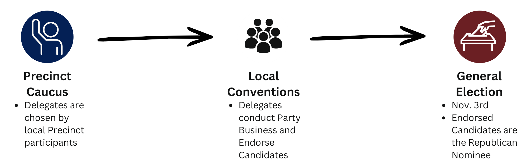 Delegates are voted in at caucus by their neighbors to represent their precinct at the area conventions. Delegates have the important job of determining who will represent the Republican Party on the ballot in November. Similar to a job interview, delegates are tasked to vet the candidates and vote to endorse the best candidate for the district.