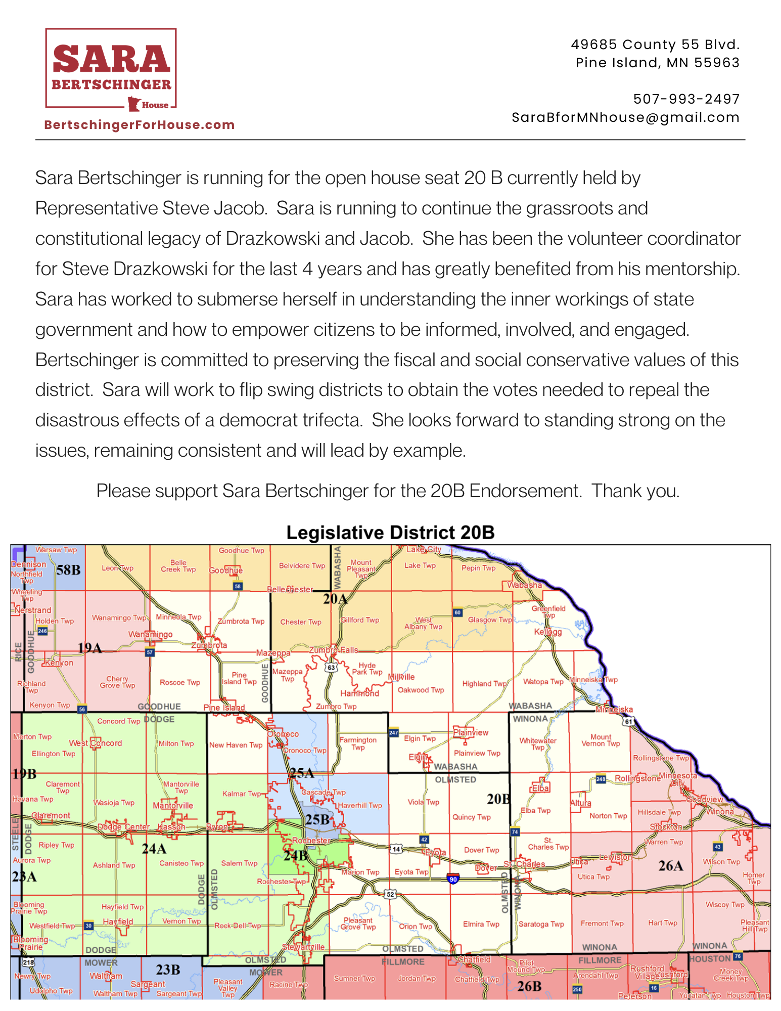 Sara is running to continue the grassroots constitutional conservative legacy promoted by Steve Drazkowski and Steve Jacob. Among Sara’s top issues are fraud prevention, reducing bureaucratic barriers, and empowering Minnesotans for success with an emphasis on local vers central governance. Sara advocates for a balanced approach to oversight and regulation, stating, “Burdensome bureaucracy and government overreach stifles everything from small business owners to farmers.” Sara is committed to reviving the classic “American Dream”, reigniting hope, and empowering an informed and engaged citizenry to participate in civics locally on up. It will take all of us to reclaim Minnesota!